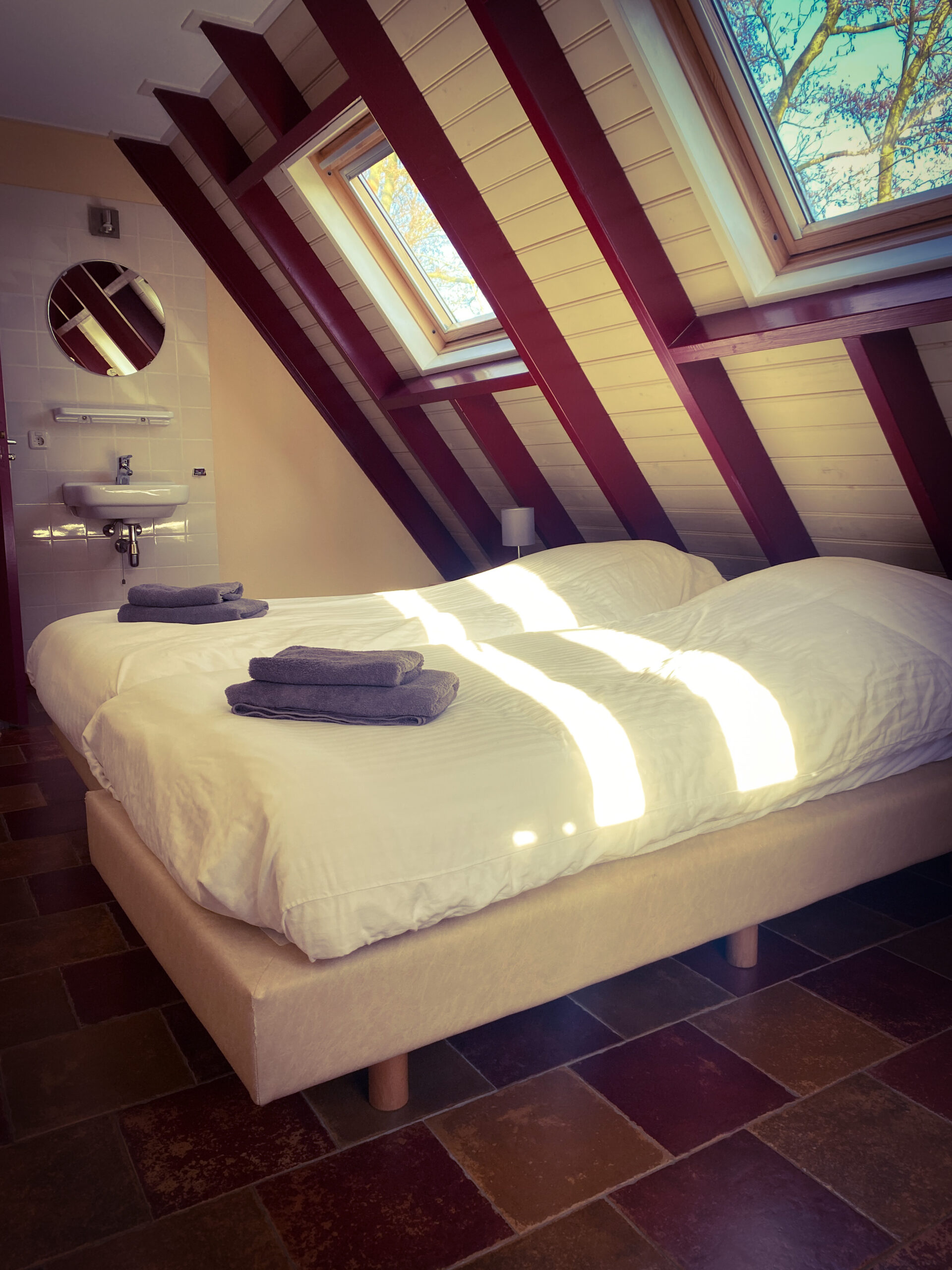 7 slaapkamers met elk twee eenpersoons boxsprings en een wastafel. Één kleinere slaapkamer met alleen twee eenpersoons boxsprings. Er zijn twee aparte douches en een luxe badkamer met douche en ligbad / whirlpool.
